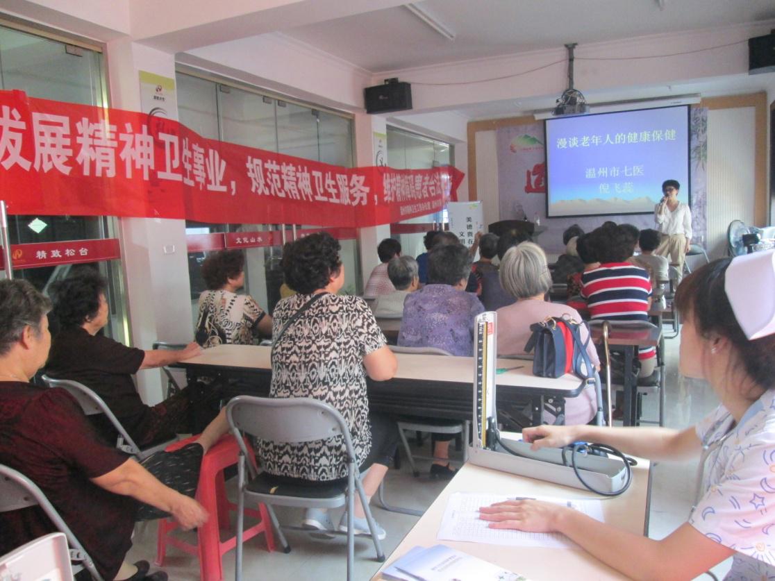 倪医生在讲座过程中重点针对老年人常见病:高血压、糖尿病与老年痴呆进行了深入讲解,告知老人们要保持健康生活,增强保健意识的同时,更要保持身心平衡。同时篮球博彩医护人员为老人进行血压测量。并发放老年精神健康相关的各种科普读本近200册。