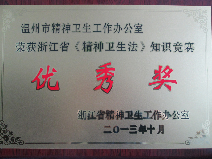 2013年10月,经浙江省精神卫生工作办公室评选,我市精卫办(篮球博彩)荣获浙江省《精神卫生法》知识竞赛优秀奖。