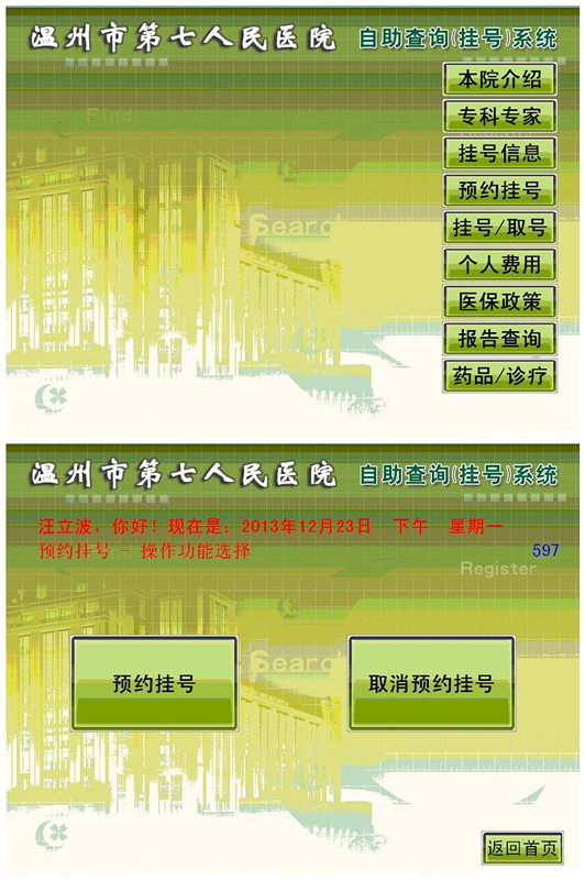 的出诊专家;第二,可预约今天起两周内出诊的专家,方便患者安排时间,节省挂号排队的时间。第三,自助取号,网上预约,电话预约的用户可直接到自助终端进行取号,方便快捷,不用排队;第四,专家排班出诊时间查询;第五,专家详细资料介绍。