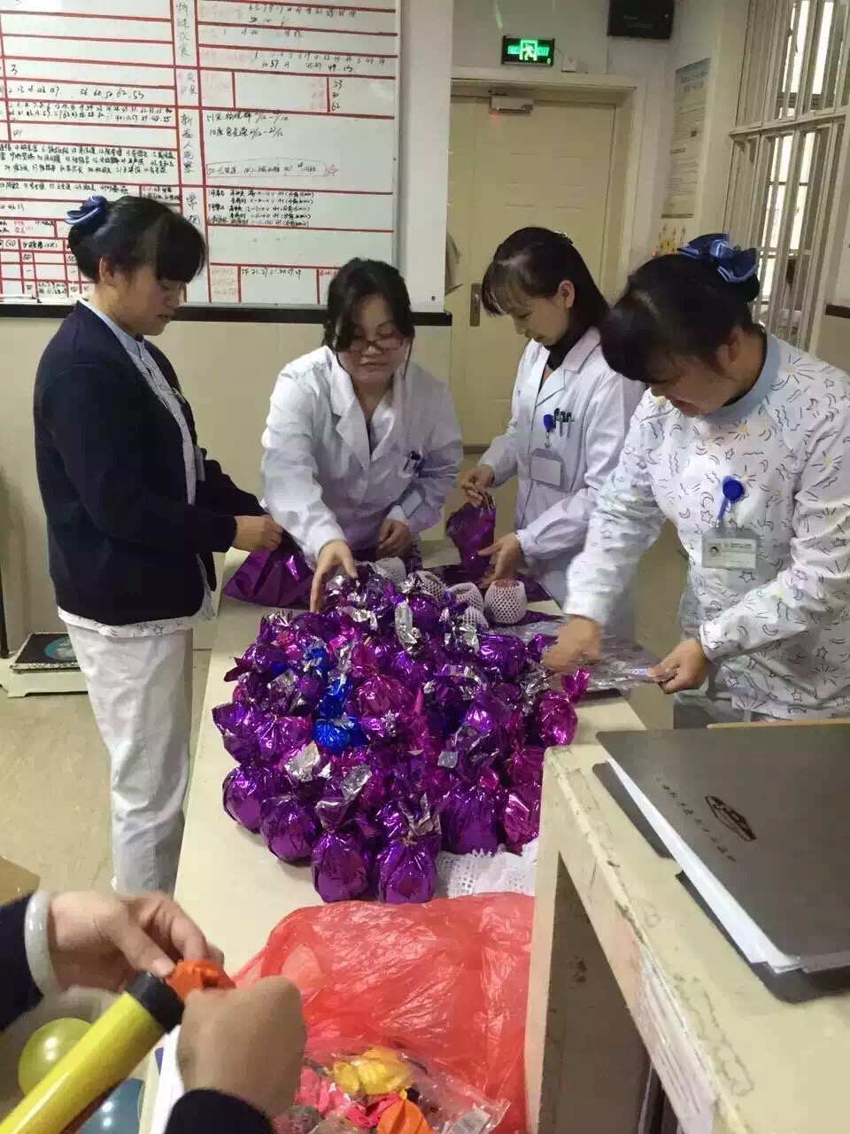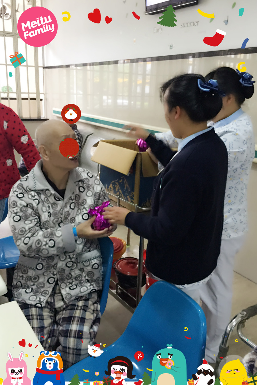 1224号是平安夜,一病区的医生和护士为病人们精心准备了“平安果”。为增添节日气氛,大家亲自动手,用缤纷的彩纸包装苹果,还有人忙着吹彩球,在欢快的圣诞歌声中装扮病室及走廊,最后由科主任及护士长带头将平安果送到科室每一个患者、家属、护工、陪护的手上,并送上衷心的祝福。圣诞的愉悦氛围一下子吸引了许多患者及家属的积极参与,给平日里显得沉闷、呆板的病房增添了许多不同于往日的快乐和轻松,拉近了患者、家属、医护之间的距离。