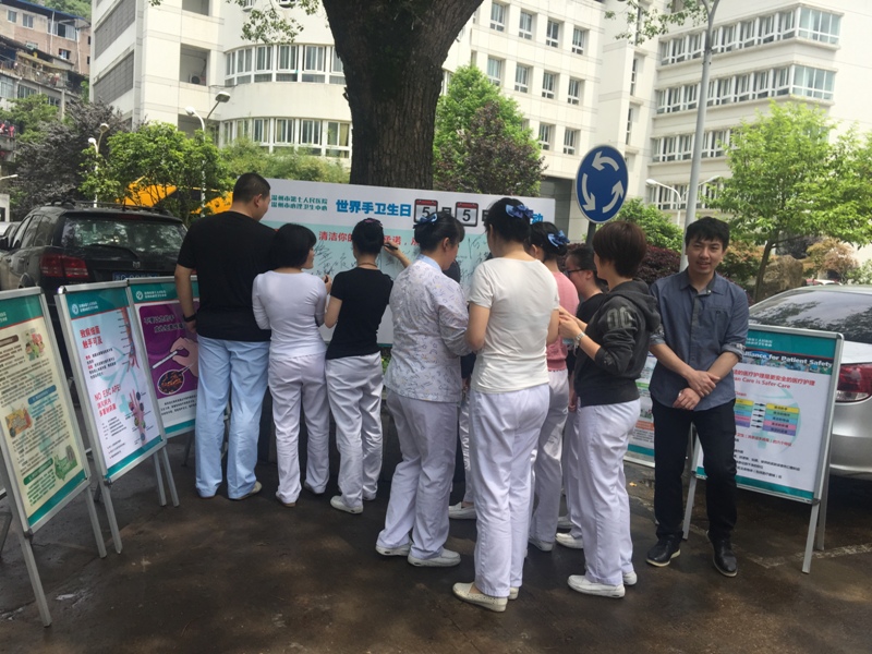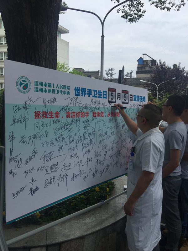 食堂门口摆放手卫生规范、操作、洗手时机等相关知识宣教展板,制作“拯救生命,清洁你的手--我承诺,从我做起”签字板,院领导、职能科室负责人、医护人员、特检人员、窗口收费人员、保洁员等200余人参加了承诺签名活动。