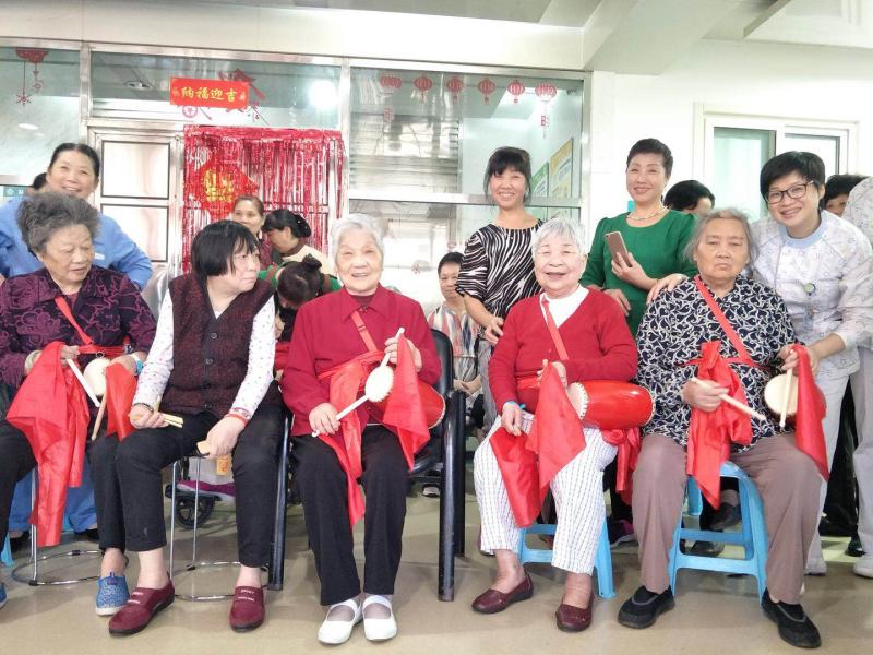 老人的学习热情高涨,积极参与锻炼,提高机体能力。虽然动作不是很到位,但是看他们认真学习的模样让我不禁回想起我们小学学广播操的那一幕。虽然好多早已过了花甲之年进入耄耋之年,一条条深陷的皱纹在他们脸上留下岁月的痕迹。但此刻的他们就像孩童般一样纯真简单。每日,他们在这做早操、欣赏音乐、学习唱歌、学习折纸、绘画、练毛笔字……这一幕幕的生活写照为康复室增添了不少色彩。