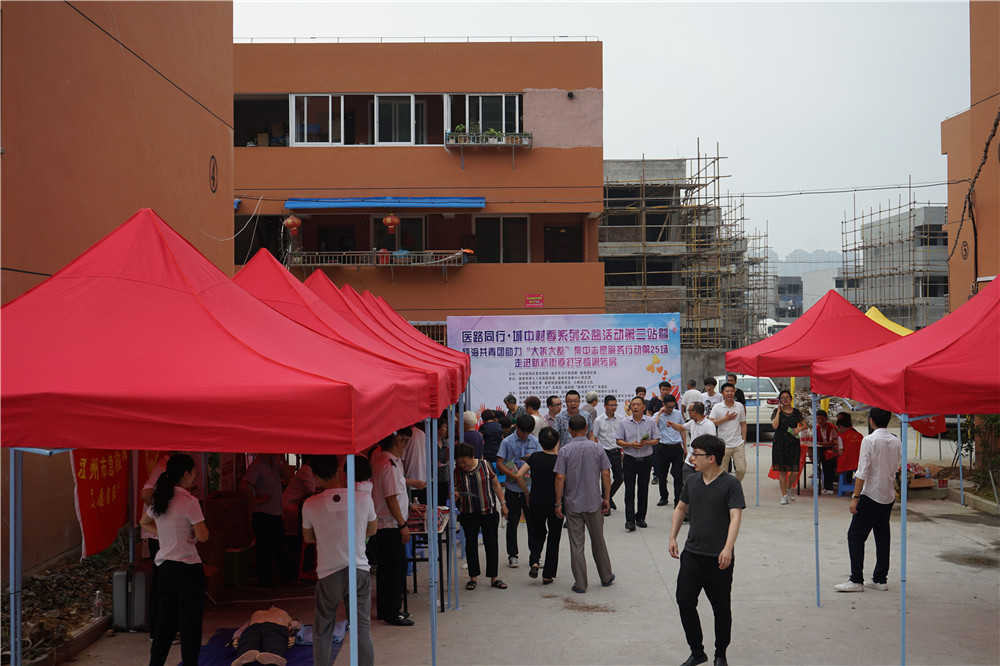 在新桥街道打字蜡周转房处,闻讯赶来参加活动的群众排起了长长的队伍,秩序井然地参加现场医护人员提供的医疗义诊服务。