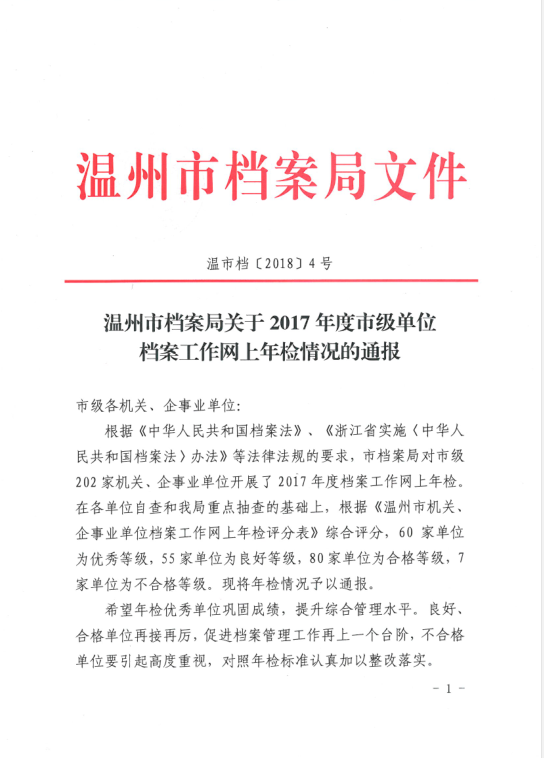 温州市档案局近日印发了关于2017年度市级单位档案工作网上年检情况的通报表彰文件,篮球博彩榜上有名,被评定为年度档案工作优秀单位。