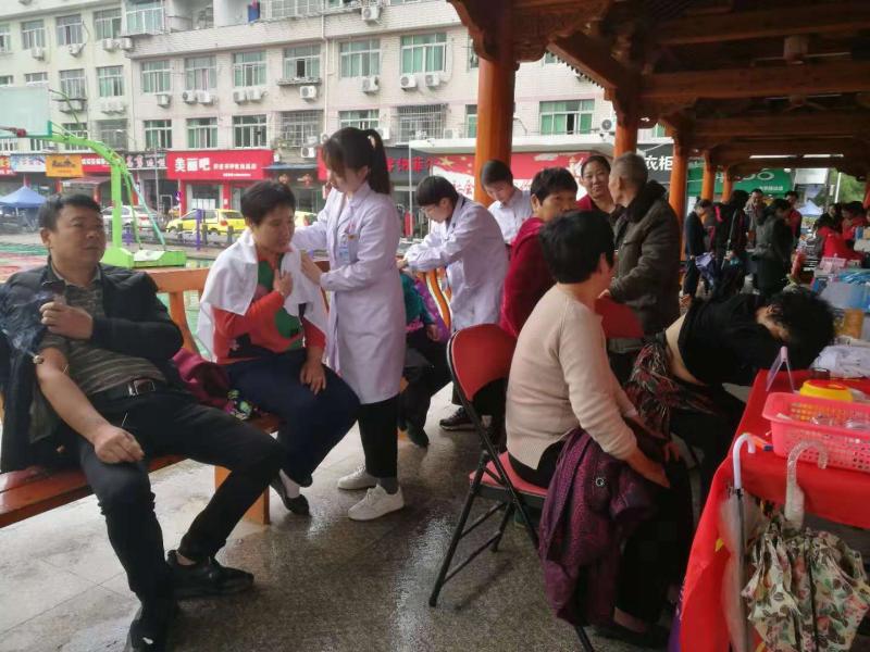 本次义诊活动在上午9点准时开始,虽然天公不作美,一直淅淅沥沥地下着小雨,但前来居民却是络绎不绝。许彬彬医师首先运用娴熟的中医诊脉技术为居民群众进行体质辨识及脏腑功能评价,并借助针灸理论为居民群众讲解了诸多颈肩腰腿痛病的日常保健、锻炼方法及注意事项。然后再根据居民的具体症状分别针对性地选择针灸,艾灸以及推拿治疗,而陈怡治疗师则辅助许彬彬医师为有需要的居民进行了推拿治疗。两位医师还向广大居民群众普及中医预防保健知识,以及冬病夏治、冬令进补等中医特色项目。