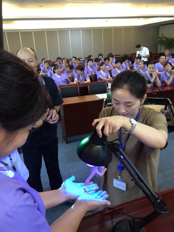 本次培训感管科采用荧光灯显示法,邀请了6位工勤人员上台演示洗手效果。形象的演示让工勤人员目瞪口呆,也使他们更加深刻的认识到手卫生的重要性,取得了预期的效果。
