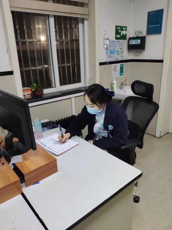 据了解,这名护士叫谢陆秀,所在病区收治的病人均是110送来的流浪精神患者。当天晚上,二十二病区的3个区域内均有一名护士负责值班。“下午4:30上班时,突然头疼得厉害,自己一测体温已经38.5°了。”谢陆秀说,当时白班护士陆续下班了,想着临时请假没有顶岗,便找病区的陈瑶偏医生诊断并开了药。为了尽快让自己恢复到工作状态,于是“见缝插针”让同事给挂上了点滴,顺手又将晚上需要派发给病人的药品进行了清点登记。那一晚,她全程戴着口罩坚守岗位。