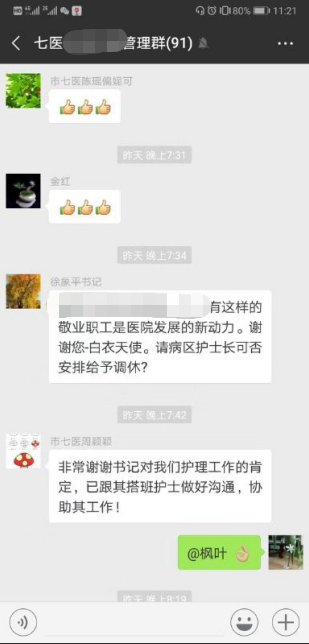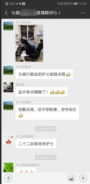 的微信工作群里,医务科长陈策将一张挂着吊瓶坚守岗位的护士照片发到群里,引来群里无数同事竖起了大拇指点“赞”。