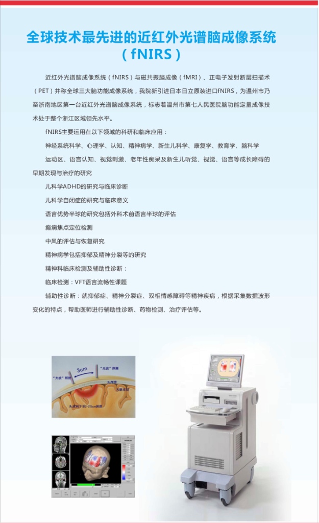 精神科主任医师许毅教授来指导交流,在徐象平书记、林小东院长、姜德国副院长及相关职能科室负责人的陪同下参观了篮球博彩潘桥院区。在特检科,特别了解了近红外光谱脑功能成像系统(fNIRS)的功能和用法,fNIRS为温州市乃至浙南地区第一台近红外光谱脑功能成像系统,标志着篮球博彩脑功能定量成像技术处于整个浙江区域领先水平。
