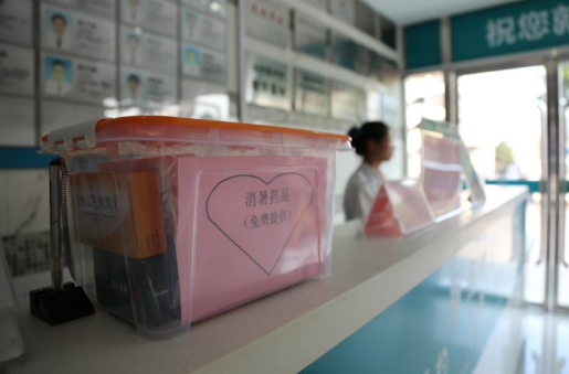 市七医门诊导医台“消暑爱心驿站”由导医台护士管理,粉红色爱心标识驿站内设有方便爱心药箱,并备有常用藿香正气水、人丹、风油精等消暑药品,同时还提供“爱心专座”以及饮用水、伏茶等,为前来就诊的患者小坐休憩的提供“好去处”。